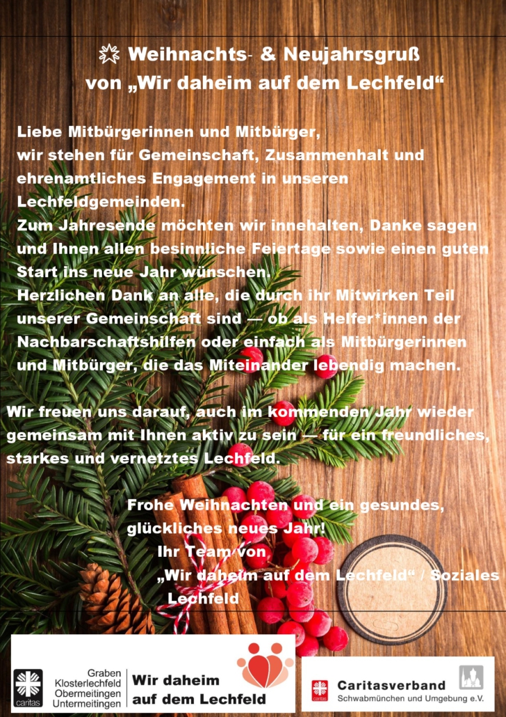 „Wir daheim auf dem Lechfeld“ ist ein sozialer Zusammenschluss der Gemeinden Graben, Klosterlechfeld, Obermeitingen und Untermeitingen. Die Gemeinden wollen das soziale Miteinander auf dem Lechfeld stärken, das ehrenamtliche Engagement fördern und das Lechfeld als Sozialraum besser vernetzen.