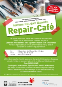 In regelmäßigen Abständen gibt es ein Repair-Café. Hier können Menschen kaputte Dinge reparieren lassen. z.B. Kleidung, Elektrogeräte oder Fahrräder – viele Helfer sind da, um zu helfen. Jeder kann mitbringen, was er reparieren möchte. Die Atmosphäre ist freundlich und entspannt. Es ist eine gute Gelegenheit, neue Leute kennenzulernen und etwas über Reparaturen zu lernen. Das Repair-Café fördert Nachhaltigkeit, denn es hilft, Müll zu vermeiden. Kommen Sie vorbei und bringen Sie Ihre defekten Dinge mit! Gemeinsam machen wir sie wieder ganz!