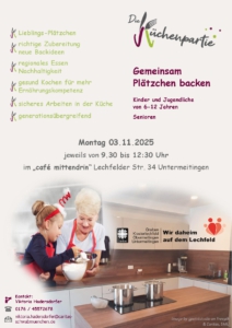Die Küchenpartie bringt Jung und Alt zusammen, um gemeinsam zu Plätzchen zu backen und zu essen. Bei diesen generationenübergreifenden Treffen steht der Spaß im Vordergrund: Gemeinsam neue Backideen entdecken, voneinander lernen und den Austausch genießen. So fördert das Projekt das Miteinander zwischen den Generationen.